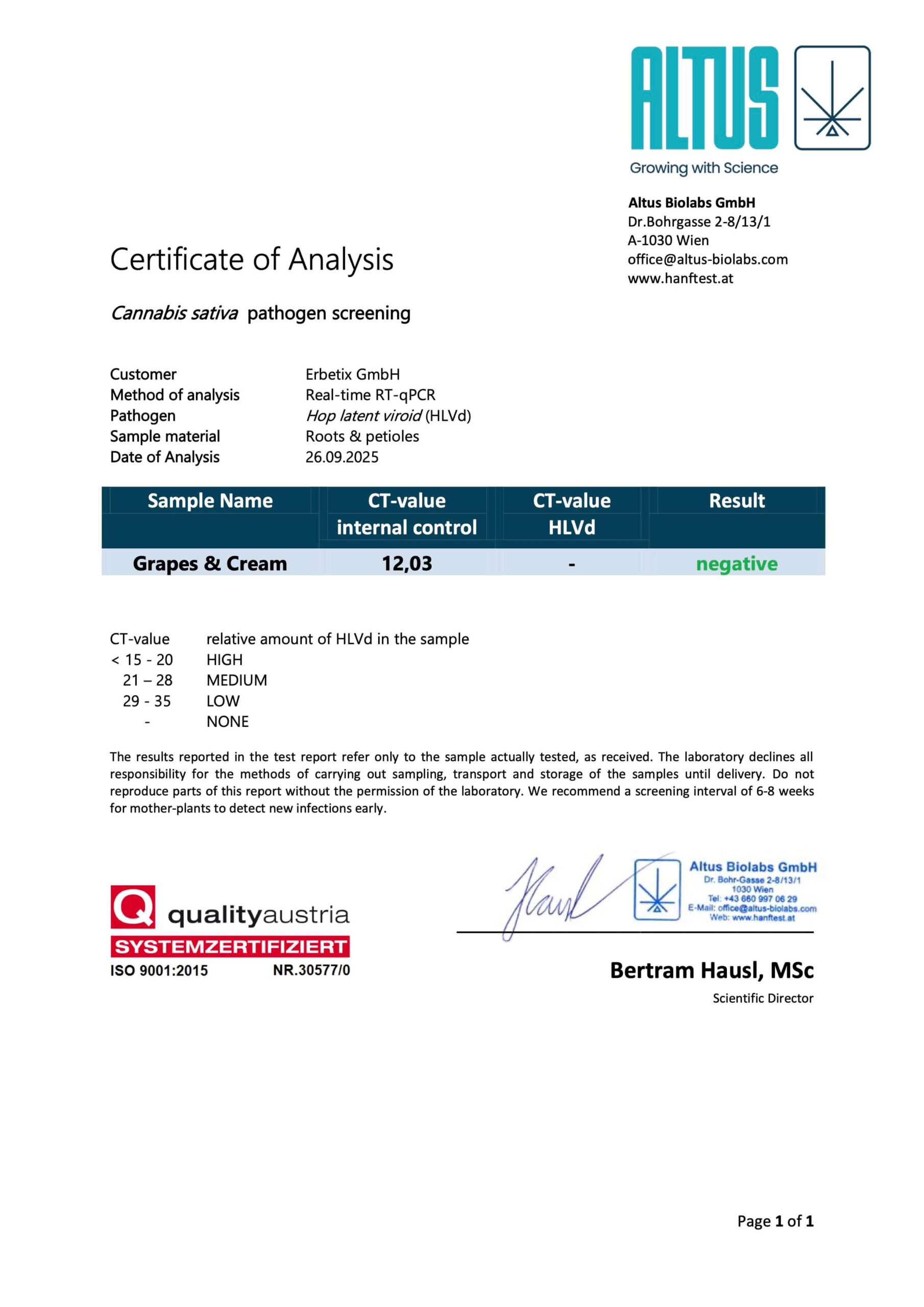 Naše genetike redno testiramo na bolezni, predvsem na Hops Latent Viroid. Testira jih Altus Biolabs.